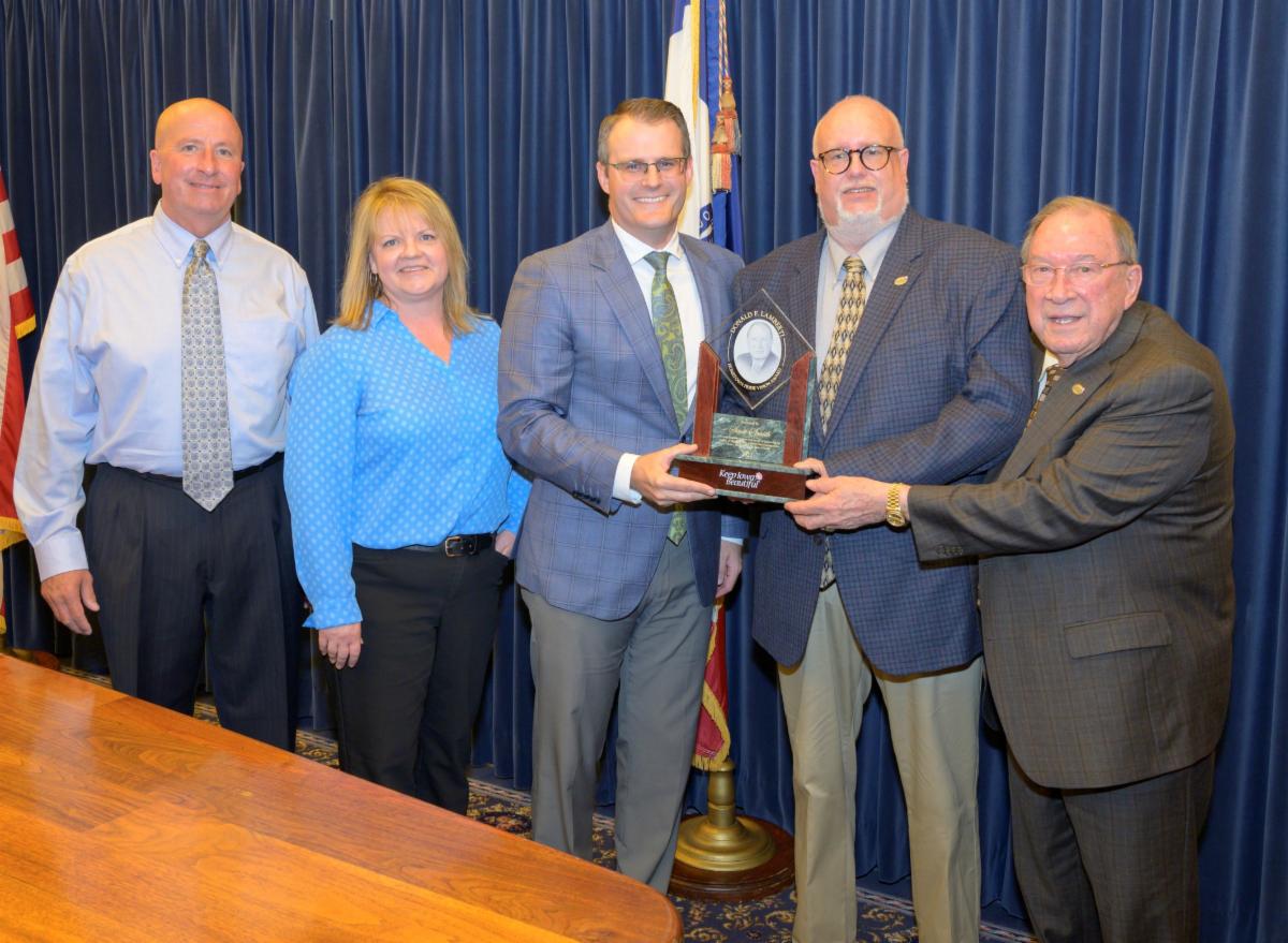 Pictured (L-R): Andy Frantz, KIB Executive Director; Reo Menning, Chair KIB Board of Directors; Lt. Gov. Adam Gregg; Jenna Ramsey & Kevin Cabbage, Farmers Mutual Telephone Company. | |