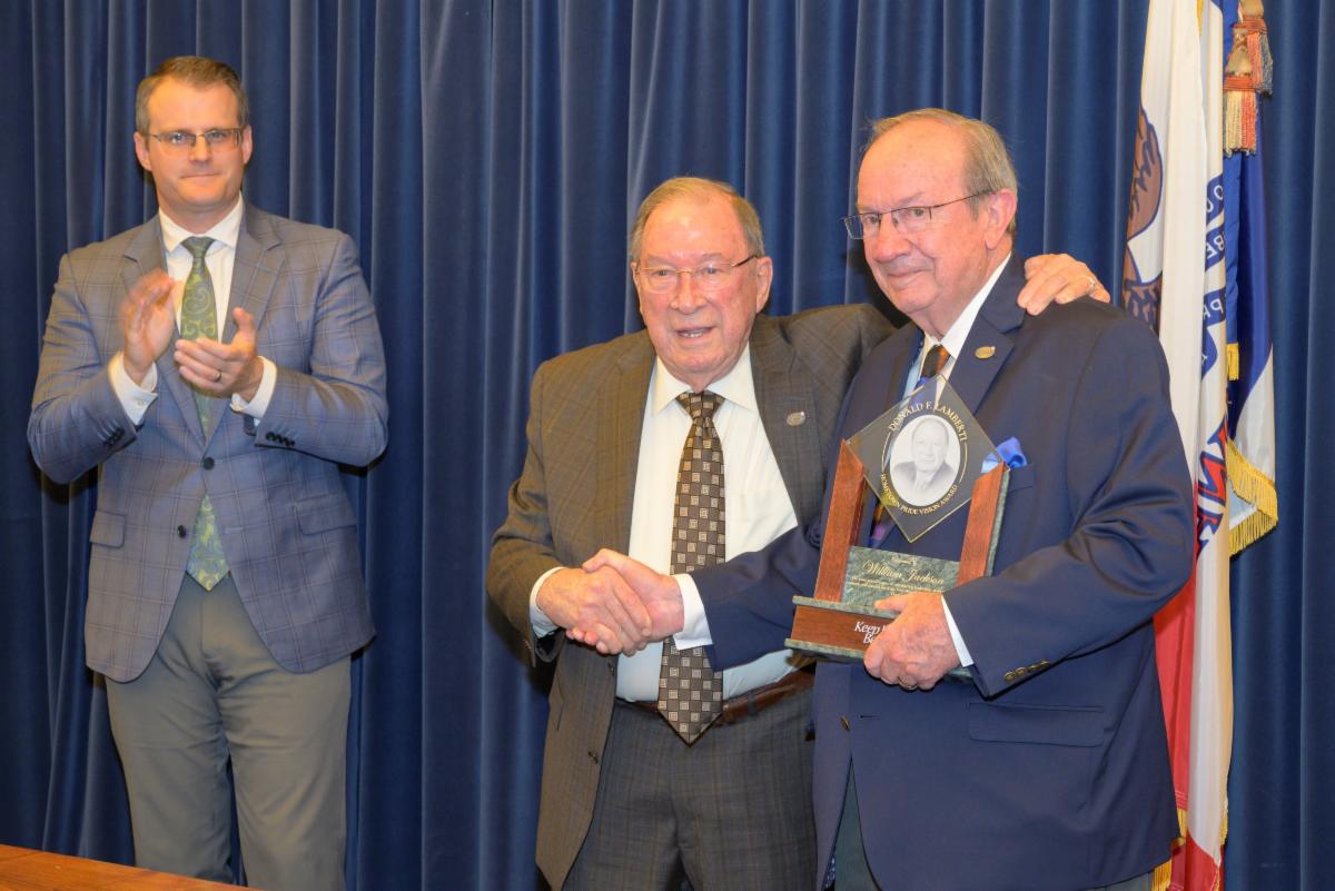 Near the conclusion of the award ceremony, Reo Menning, Chair of the Keep Iowa Beautiful Board of Directors, announced there was one more Donald F. Lamberti Hometown Pride Vision Award to make. The award, a complete surprise, was made to long-time Associate Director of Keep Iowa Beautiful Bill Jackson "for his over 20 years of outstanding leadership, dedication, support, and passion for Keep Iowa Beautiful's mission and values." Jackson was "speechless", a rare occasion for him. | | |