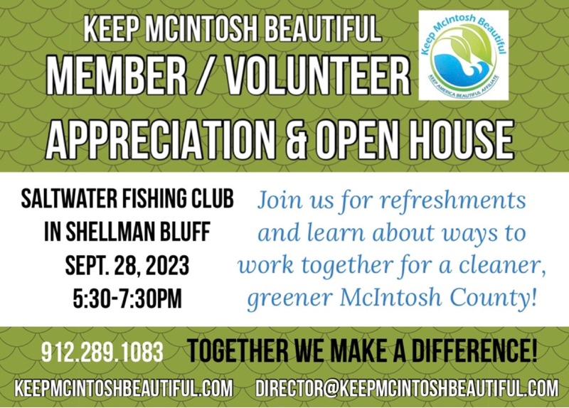 Mark your calendars! SEPT. 28 FROM 5:30-7:30PM at the SAPELO SALTWATER FISHING CLUB in Shellman Bluff. We want to show our APPRECIATION to all of our members and volunteers. AND we'd love for you to join us for the OPEN HOUSE to see what Keep McIntosh Beautiful is all about and ways you could get involved. You can renew your membership, join KMB (new members will get t-shirts), or simply come see the community activities we are involved in. Please help us get the word out! Share the event on Facebook and tell all your friends and neighbors. There will be refreshments!