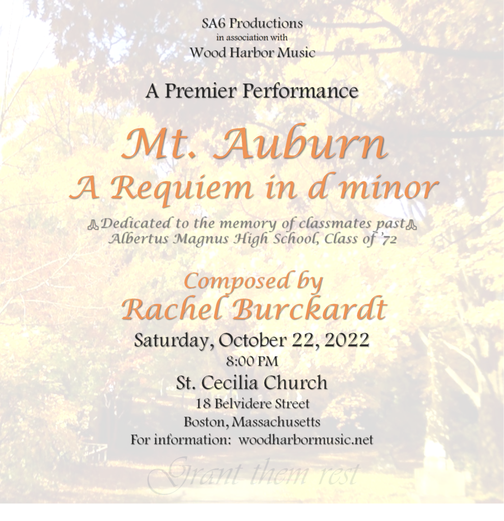 Tickets to “Mount Auburn, Requiem in d minor” are general admission $25, students and seniors $8.50, preferred seating $50, available on EventBrite, or at the door. Sponsor donation options range from $100 – $1000. Reduced-rate parking for $14 is available at The Hynes Auditorium Garage (located at 50 Dalton Street between Bukowski Tavern and Summer Shack). To obtain the discount, ask a concert greeter for a chaser ticket which can be used at the garage’s exit gate machine. Alternate paid parking is available at the Prudential garage. The church building is fully accessible by elevator at both the street level entrance on Belvidere Street, and at the entrance on the corner of St. Cecilia and Scotia Streets.