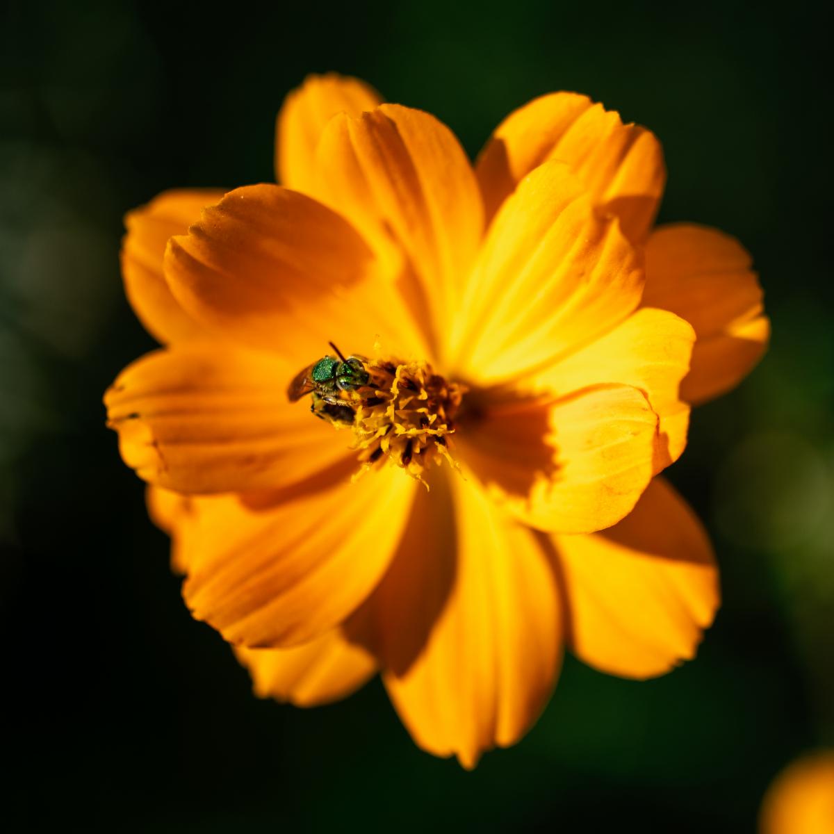 This week: Agapostemon virescens, also known as the bicolored striped sweat bee. In the spring, a colony of these tiny iridescent green beauties took up residence in our backyard bed of native ferns. Alex and I have learned that, like most of our native bees here in Massachusetts, Agapostemon nest in the ground, but one thing that sets them apart is that they live communally instead of building solitary burrows. So at the very edge of our fern bed, protected under the fronds from rain, there is a sort of bee apartment complex of five very small dirt mounds, each with a hole at the top. While most of the sweat bees are out pollinating, a few stay behind to protect the burrows. Alex and I check on them each day, crouching down to observe their tiny green heads emerge to look back at us before determining that we are not a threat and retreating again. And we love watching these jeweled pollinators enjoy the flowers in our garden. We are honored that these beautiful and important bees have chosen our yard to make a home.