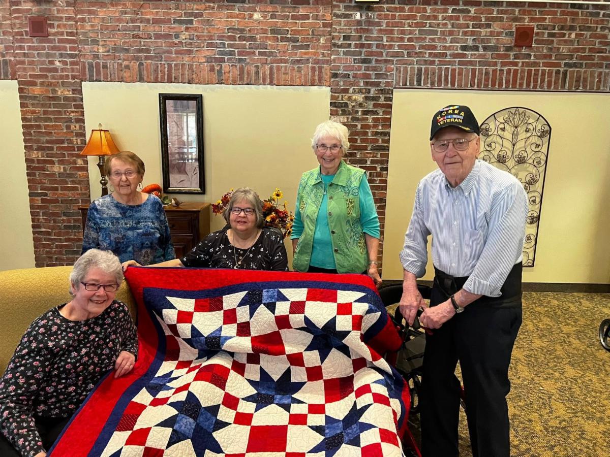 With the support of staff, a group of volunteer sewers was assembled. One resident donated the fabric, a quilt pattern was chosen, and work began. The only expense was the professional quilting, which Presbyterian Homes of Bloomington agreed to cover. Staff selected the recipient, and arrangements were made with Quilter’s Haven, a local chapter of the QOV Foundation, to register and formally award the quilt.