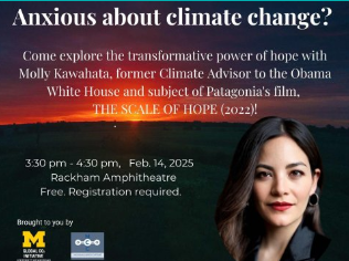 Molly Kawahata, former climate advisor to the Obama White House and subject of Patagonia's film, The Scale of Hope (2022) will speak about the transformative power of hope in fighting climate change. Rackham Amphitheatre, 915 E. Washington St. Free and open to the public. For more information, click here. Registration required. Click here to register.