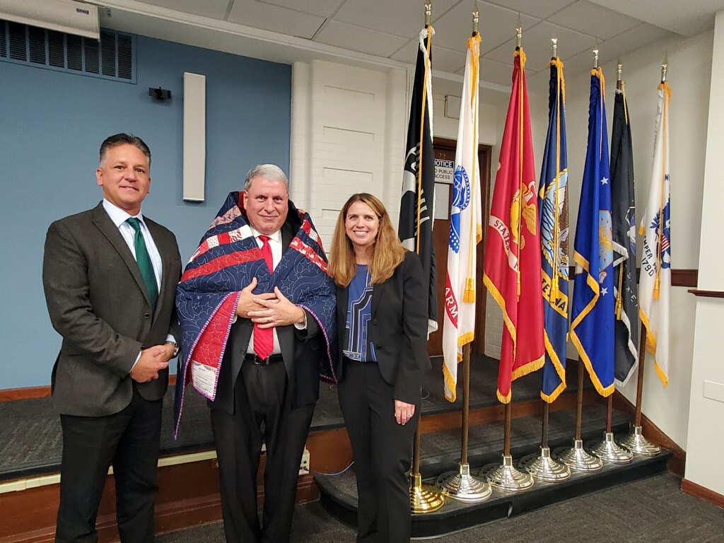 Photo left to right: In 2024, Chief Judge Robert Villa, Judge Salvatore LoPiccolo (receiving his Quilt of Valor), Judge Christine Downs