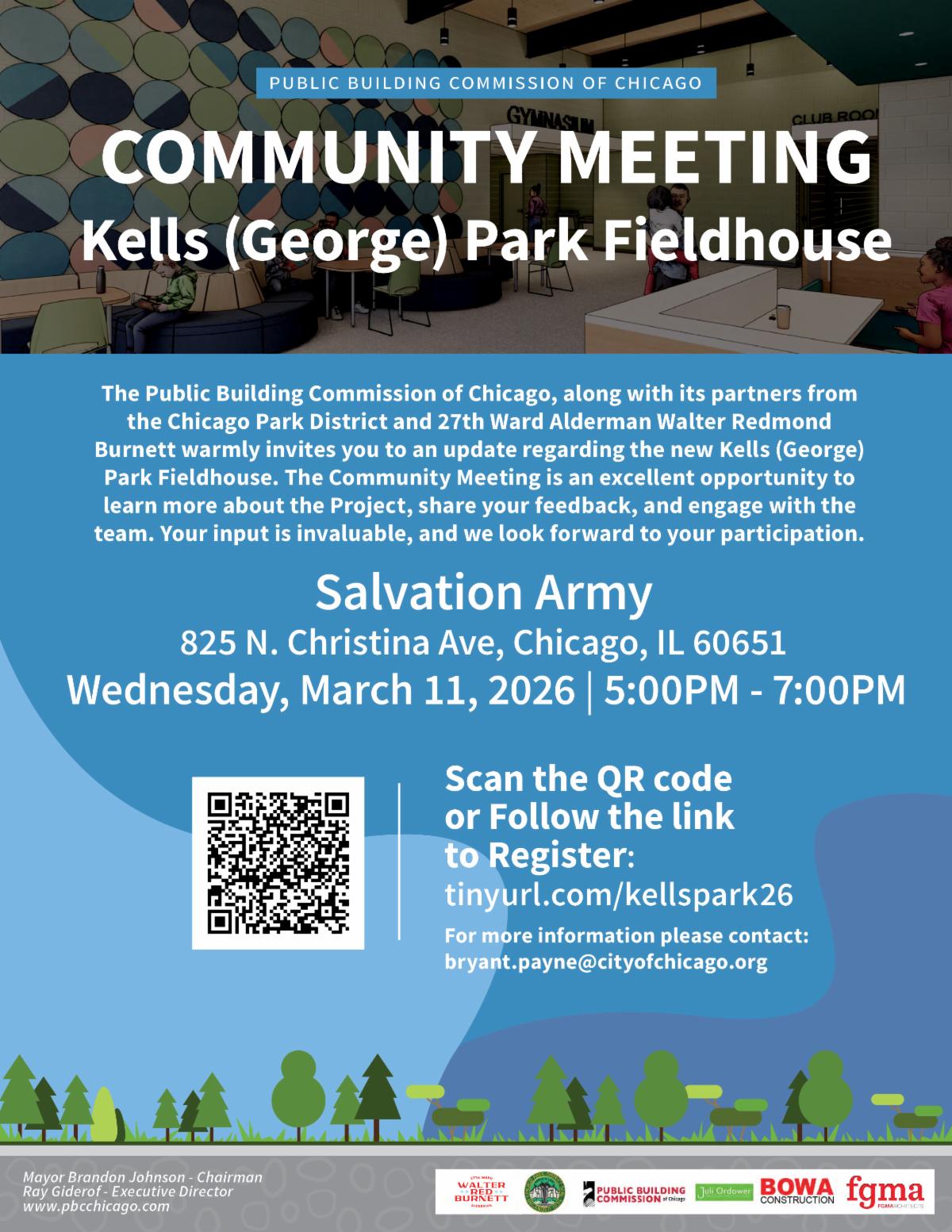 The Public Building Commission of Chicago, along with its partners from the Chicago Park District and 27th Ward Alderman Walter Redmond Burnett warmly invites you to an update regarding the new Kells (George) Park Fieldhouse. The Community Meeting is an excellent opportunity to learn more about the Project, share your feedback, and engage with the team. Your input is invaluable, and we look forward to your participation.