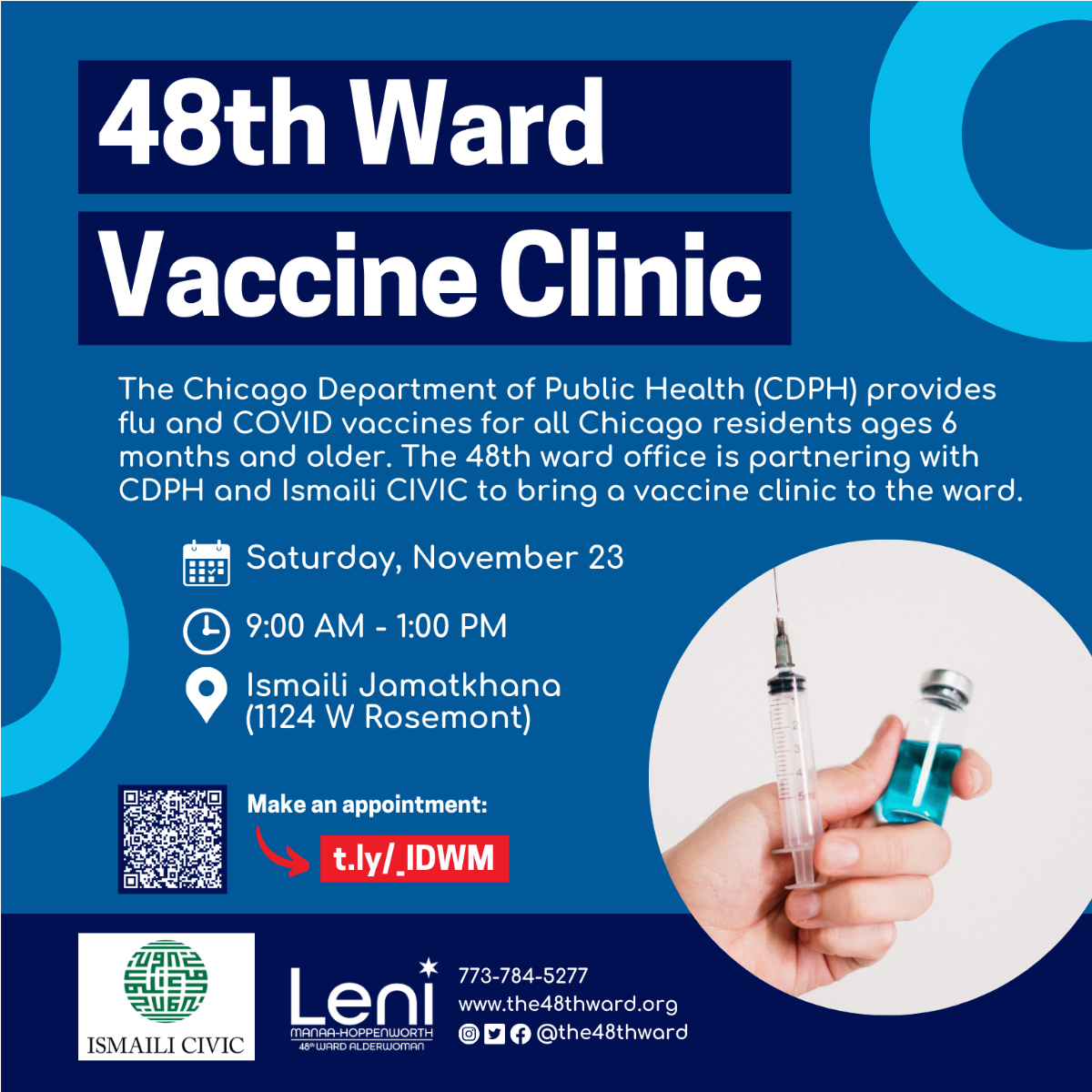 The Chicago Department of Public Health (CDPH) provides flu and COVID vaccines for all Chicago residents ages 6 months and older. The 48th ward office is partnering with CDPH and Ismaili CIVIC to bring a vaccine clinic to the ward.