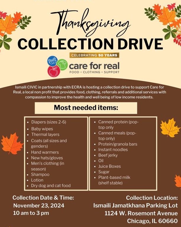 Care for Real is hosting a collection drive in partnership with Ismaili CIVIC and ECRA on November 23 from 10 am to 3 pm at the Iwmali Jamatkhana parking lot (1124 W Rosemont Ave)! See the above list of items being requested for donation for the drive.