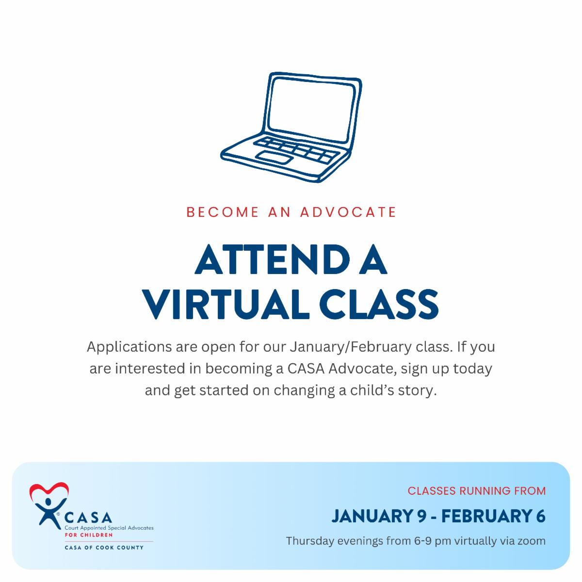 CASA of Cook County is currently accepting applications for their upcoming virtual classes to train new CASA Advocates. CASA Advocates are volunteers who go through an extensive training process before being sworn in by the presiding judge and matched with appropriate cases. They are typically assigned to one child or set of siblings and spend an average of 10 hours per month on their case, including a monthly visit with the child. There are two classes coming up: