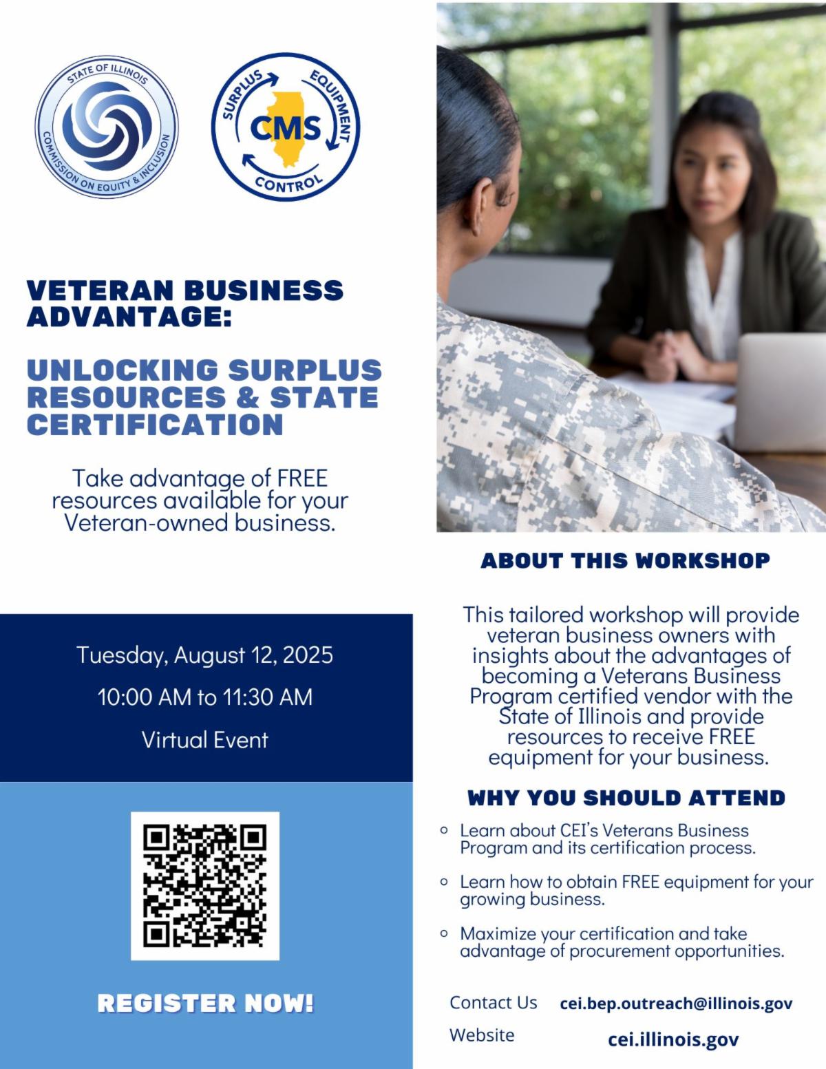 The State of Illinois Communication on Equity and Inclusion (CEI) invites Illinois veteran owned business owners to join them for the Veteran Business Advantage: Unlocking Surplus Resources & State Certification workshop on August 12, 2025, from 10 AM – 11:30 AM. This unique virtual training workshop will provide an overview of CEI’s Veteran Business Program, ensuring that participants understand the benefits of State certification, the application process and how to do business with the State of Illinois. This opportunity will also provide veteran business owners with information regarding the GSA Federal Surplus Program, and information regarding the availability of VOSBs and SDVOSBs to obtain FREE surplus property via the GSA Federal Surplus Program, and low-cost surplus property through the State of Illinois Surplus Program.