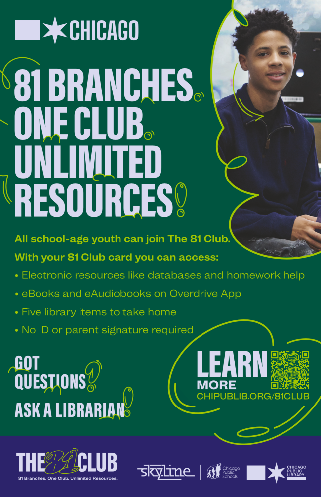| | Calling all school-aged youth! Join the Chicago Public Library's 81 Club! With the 81 card, you gain access to electronic databases, homework help, ebooks and audio books, and are eligible to take home 5 library items. Already a CPS student? Just ask a librarian about the card at your local branch! | | Midwest Water Reclamation District | | |