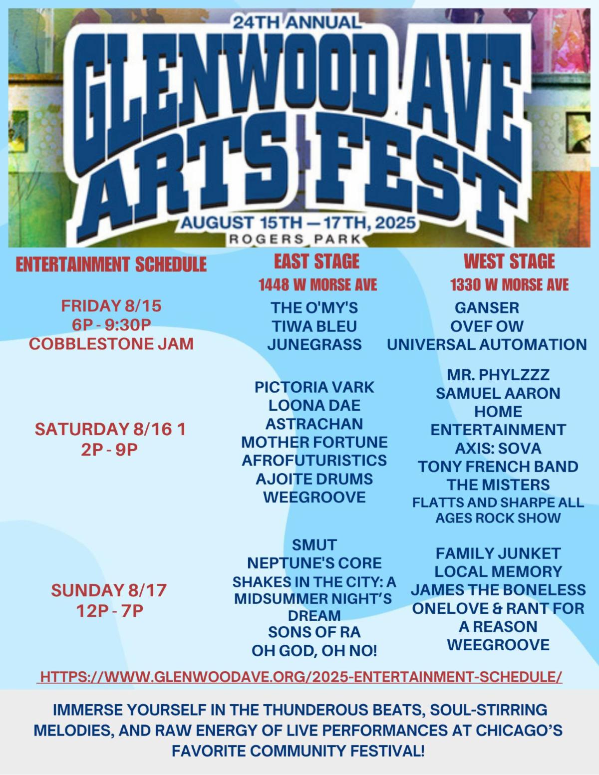 | | The Glenwood Avenue Arts Fest is a much-anticipated annual tradition in the Rogers Park neighborhood, showcasing the work of over 130 artists and more than two dozen music and dance performances, as well as live arts demonstrations, an activities area for kids, and open studios. Attendees can browse and buy artwork from 150+ local & visiting artists spanning all genres, from traditional woodworking and ceramics to digital drawing and avant-garde mixed media. The Fest is free and always will be. | | |