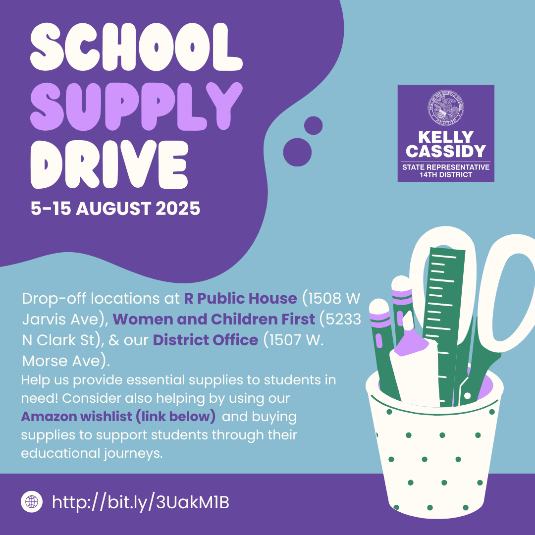 Our office is hosting a School Supply Drive from August 5th-15th in partnership with R Public House in Rogers Park and Women & Children First in Andersonville. Supplies can be dropped off at either location, in addition to our District Office at 1507 W. Morse Ave. You can use the QR Code above or click here to be taken to our Amazon Wishlist!