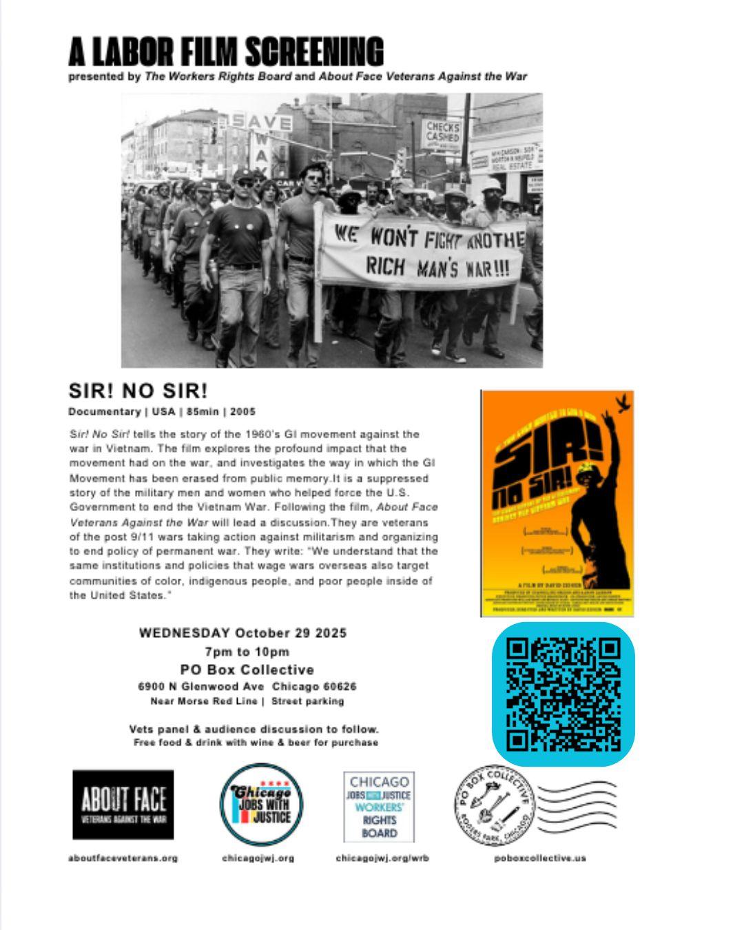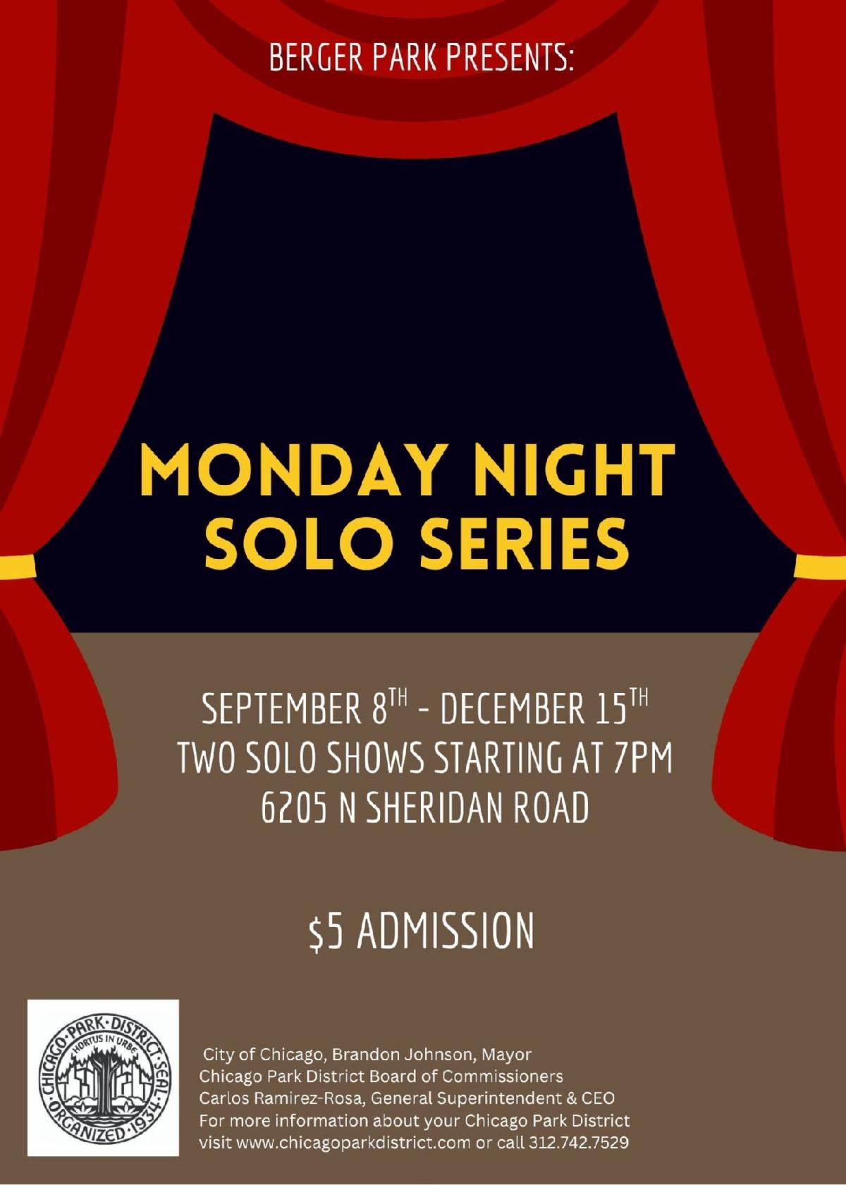 | | Chicago Northside AARP Event | | On November 4th, the Chicago Northside AARP Community Group will be meeting and discussing "How Native Americans showed us the 'Garden that Time Forgot'". Join them in person or via Zoom. Refer to the flyer above for details! | | The Workers Rights Board Film Screening | | The Workers Rights Board and About Face Veterans Against the War will be screening SIR! NO SIR!, a documentary, on Wednesday, October 29th, from 7pm to 10pm. A vets panel and audience discussion will follow the film. Free food and drink will be available, with wine and beer for purchase. Scan the QR code above for more details! | | Berger Park Monday Solo Series | | Enjoy two hour long solo performances from local creatives, comics, and performers at Berger Park, 6205 N. Sheridan.. There will be a short intermission between shows. You can learn more here. | | The Sporting Life at The Factory Theatre | | |