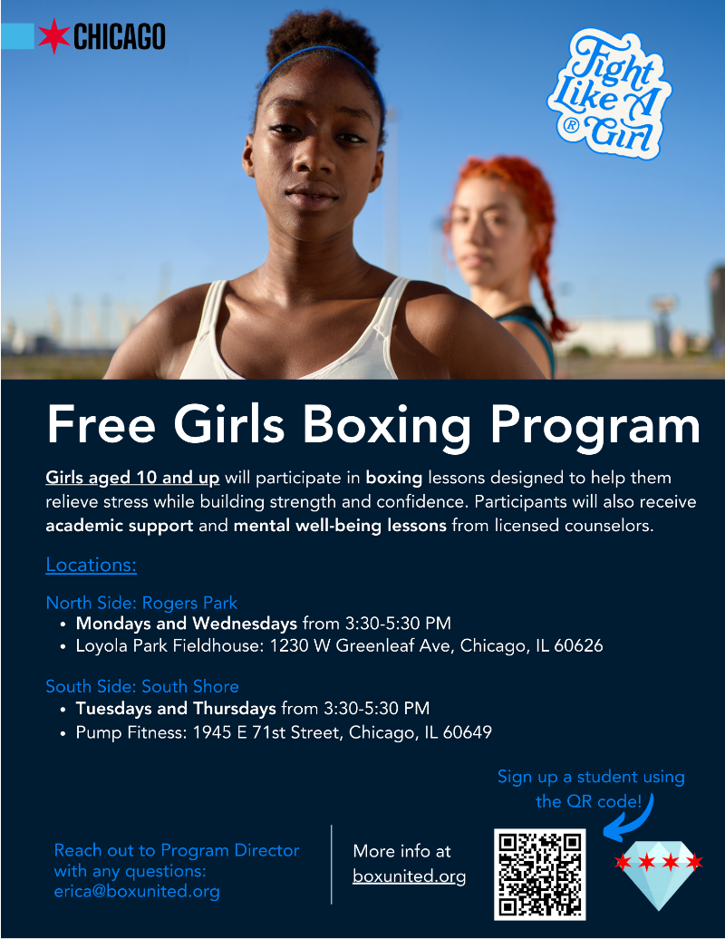 Fight Like a Girl is a boxing and leadership development program that helps girls aged 10 and up build confidence, develop a growth mindset, and, build healthy habits. Participants will learn the fundamentals of boxing and how to transfer lessons from boxing into other areas of their lives. Fight Like a Girl is run by Box United, a nonprofit on a mission to help girls use boxing to build physical and mental well-being.