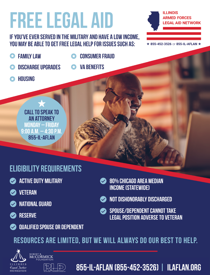 The Illinois Armed Forces Legal Aid Network is funded by the State of Illinois and provides free legal assistance to low-income veterans and active military members on critical issues including:
