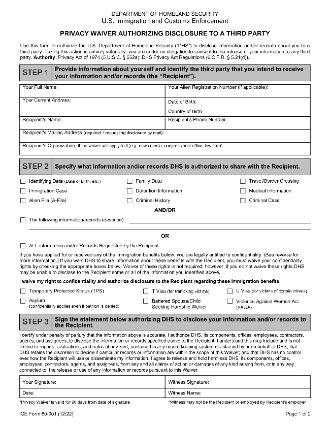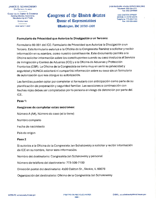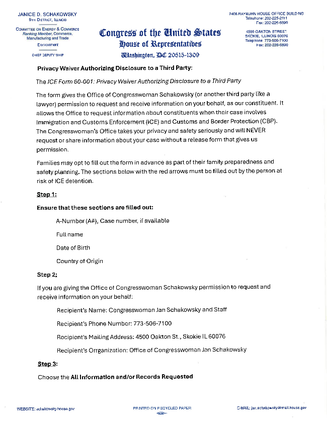 In the event that a loved one is detained, contact Congresswoman Schakowsky's office at 773-506-7100 and let them know that you have already filled out an ICE Privacy Waiver form. After contacting them, it is also recommended you fill out their digital case work form.