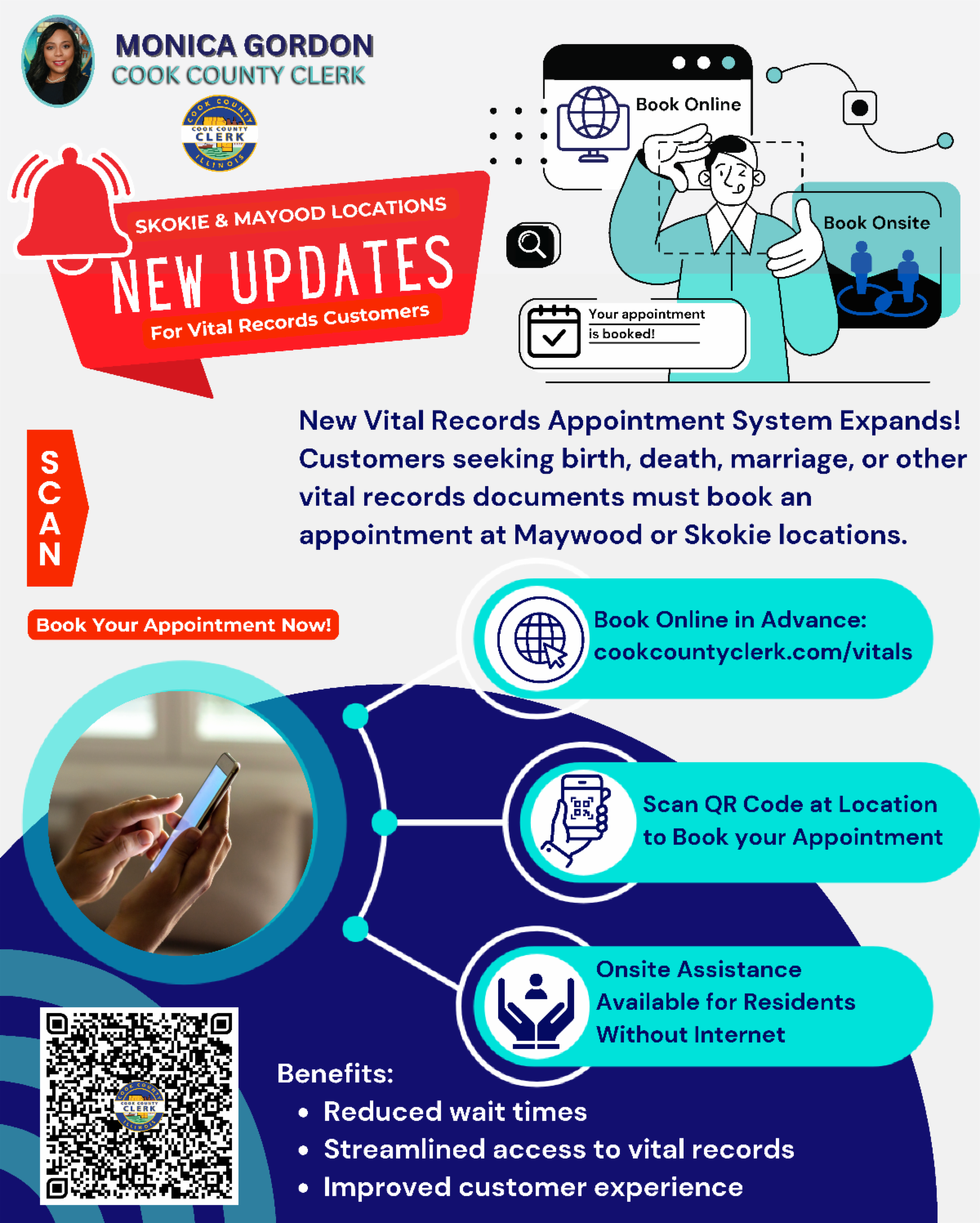 Effective October 27, 2025, they will expand their appointment-based system for Vital Records services to the Clerk’s Office at the Skokie Courthouse, at 5600 W. Old Orchard Road, Room 149. The appointment system is also being introduced at the location near the Maywood Courthouse.