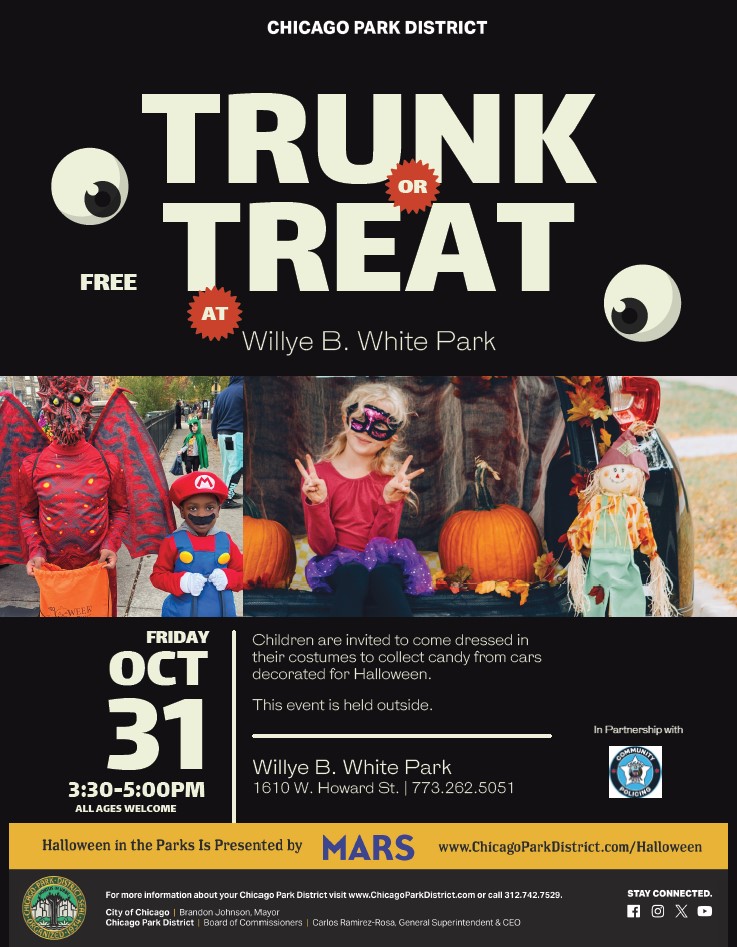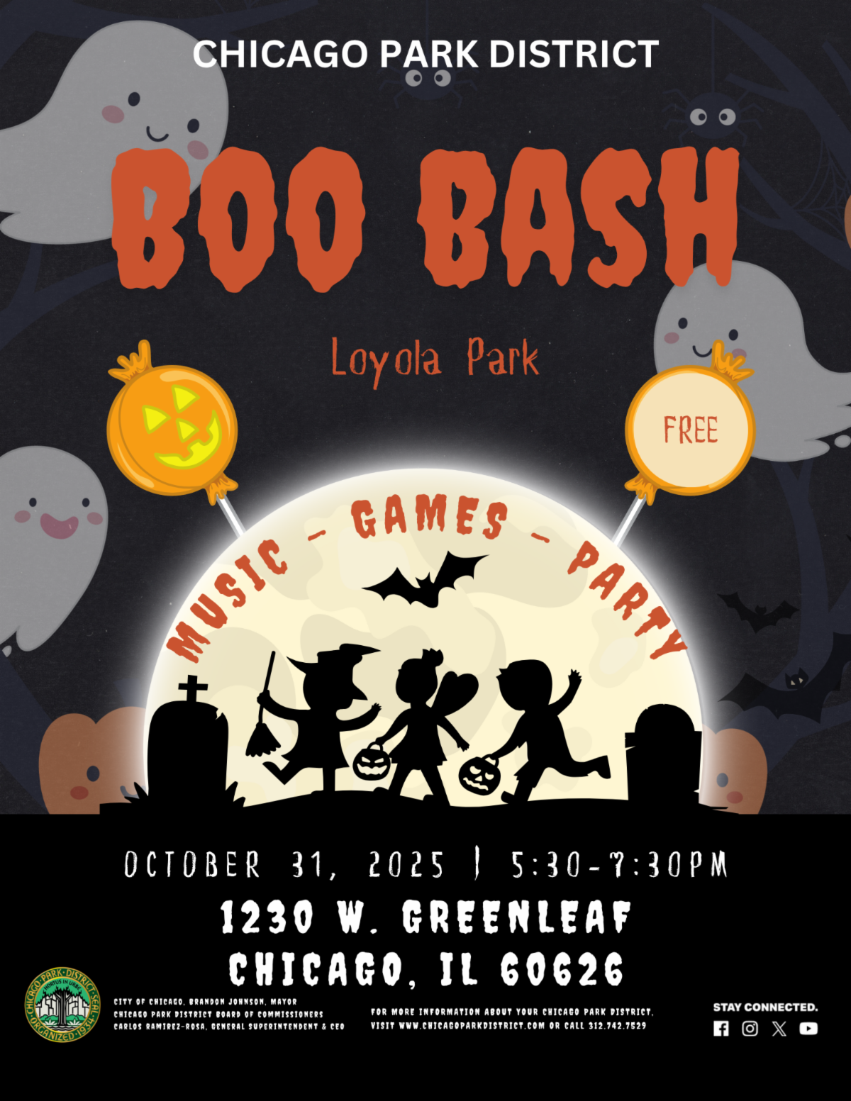 Hosted by the Chicago Park District and Loyola Park Advisory Council, this free community event invites families to celebrate Halloween together with music, games, and festive fun for all ages.