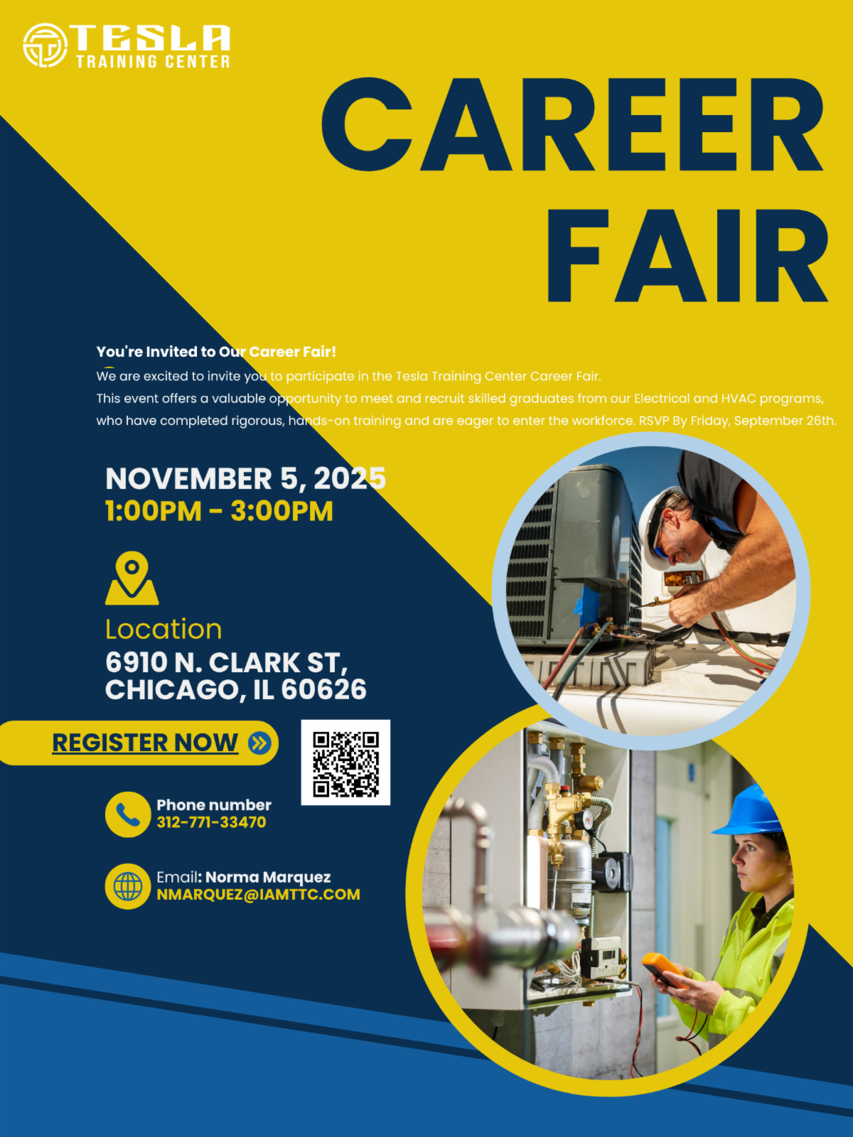 The Tesla Training Center (6910 N. Clark St) is hosting a Career Fair on Wednesday, November 5th, from 1 to 3pm.
