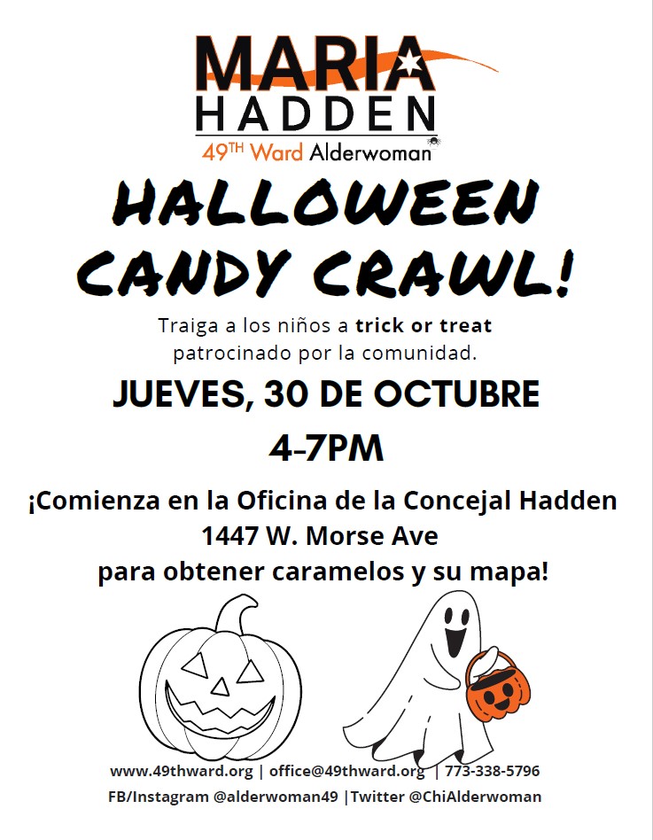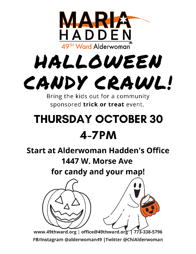 Thank you to everyone who came out to A-Ville O’Ween on Saturday. We had a blast seeing all the kids and pets dressed up for Halloween. I’m really hoping to get back from Springfield in time for the Morse Avenue Candy Crawl we love cosponsoring with Alderwoman Maria Hadden’s office Thursday afternoon from 4-7pm. And don’t forget Trunk or Treat at Willye White Park on Friday (actual Halloween) from 3:30-5pm!