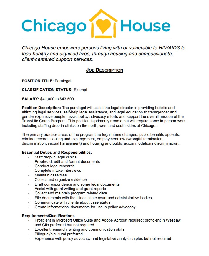 | | Chicago House Hiring Paralegal | | Click the image above for full job description document. | | |