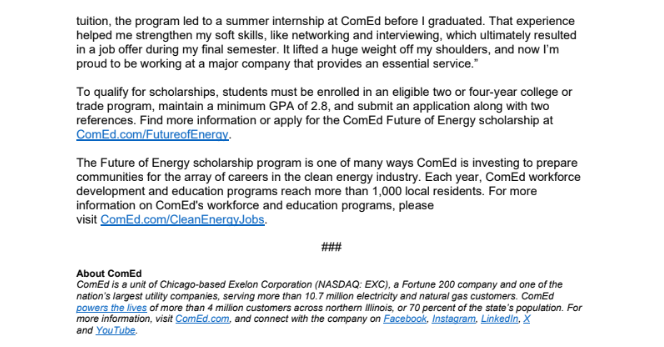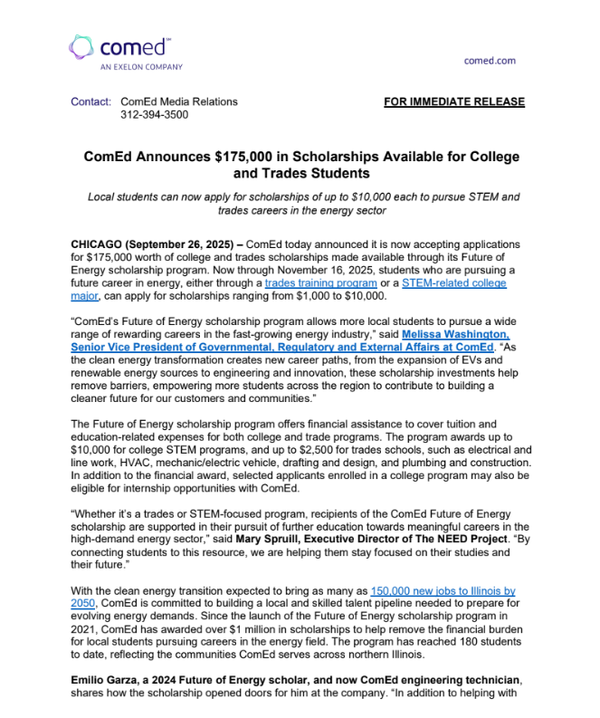 ComEd today announced it is now accepting applications for $175,000 worth of college and trades scholarships made available through its Future of Energy scholarship program. Now through November 16, 2025, students who are pursuing a future career in energy, either through a trades training program or a STEM-related college major, can apply for scholarships ranging from $1,000 to $10,000.