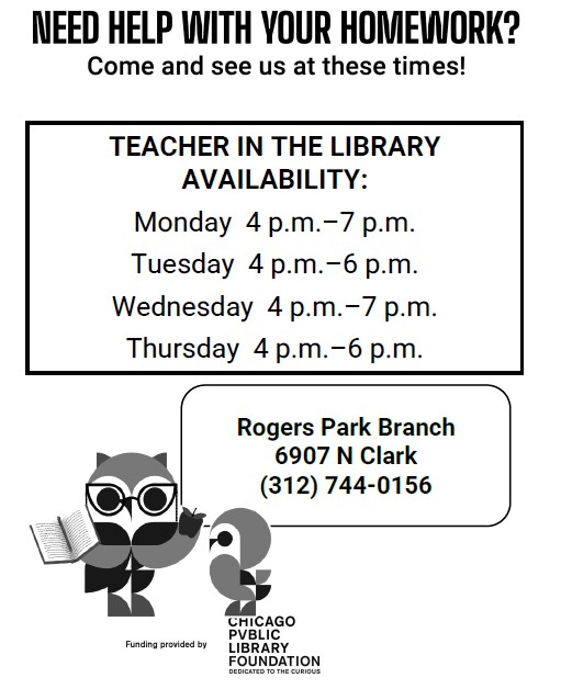 Need help with your homework? Want to improve your math, writing, or reading skills? The Teacher in the Library is back at the Rogers Park Library!