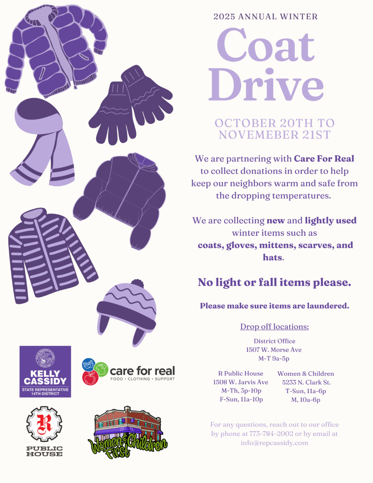 Our office is partnering with R Public House and Women & Children First to collect new and lightly used winter items for Care For Real! You can help out a neighbor in need this winter by donating items such as winter coats, gloves, mittens, scarves, and hats at one of our drop off locations.