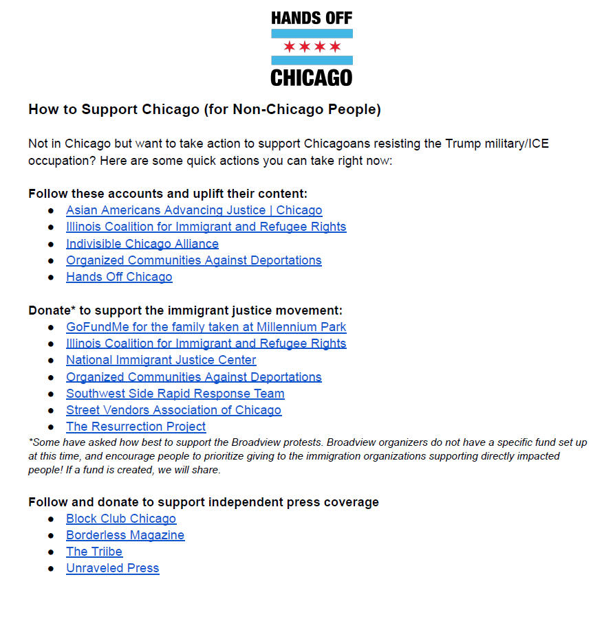 | | How to Support Chicago (For Non-Chicago People) | | You may have friends and family from outside of Chicago seeing what is happening in our amazing city and asking how they can help. The handy document above offers a list of things folks can do to help spread awareness of the situation in the city as well as help fund ongoing efforts to resist the Trump administration's occupation of Chicago. | | Appointment-Based System for Cook County Vital Records Services Expansion | | |
