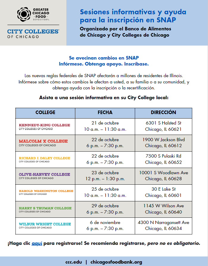 A few weeks ago City Colleges of Chicago announced an expanded partnership with Greater Chicago Food Depository, now over the next few weeks, they will be hosting Supplemental Nutrition Assistance Program (SNAP) Benefits Community Briefings together to help students and community members understand the recent changes to SNAP (Link/EBT in Illinois).