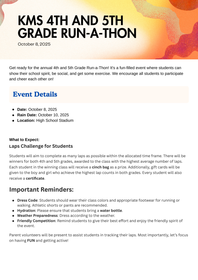 | | 4th and 5th Grade Run-A-Thon | | Parents/Guardians can now view their students' balances and make payments for the first semester online through Infinite Campus's parent portal. | | | | |