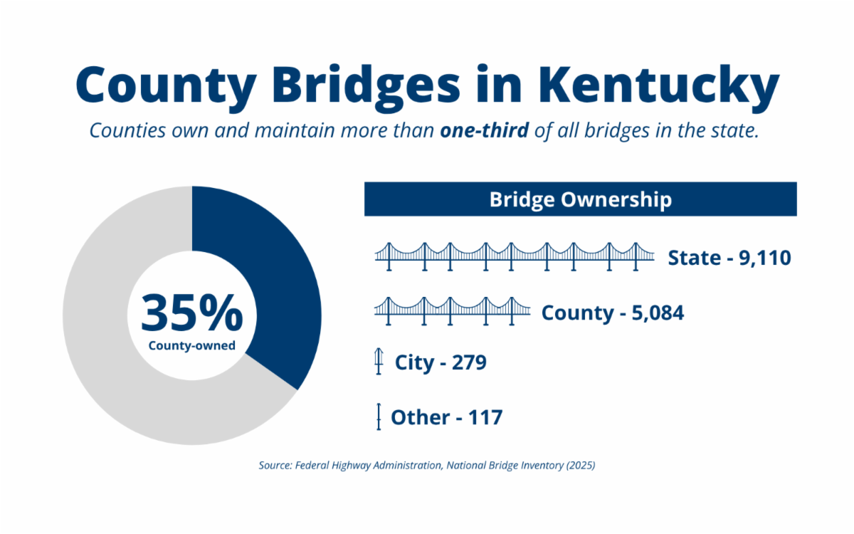 According to the Federal Highway Administration (FHWA) National Bridge Inventory, counties own and maintain 5,084 bridges – 35 percent of the nearly 15,000 bridges in Kentucky.