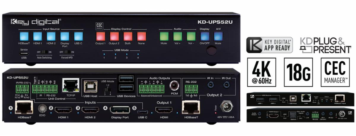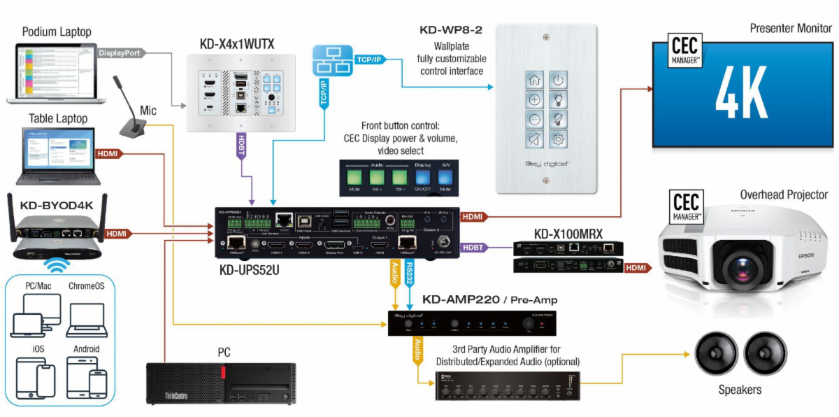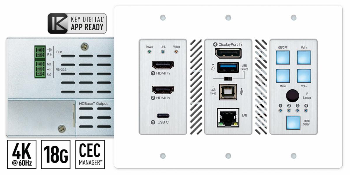 KD-4x1WUTx is an HDBaseT wall-plate transmitter + universal format switcher + soft-codec enabling interface with 2x HDMI, Display Port, and USB-C inputs, USB-A and USB-B connections. KD-X4x1WUTx is ideal for professional video installations in conference rooms, class rooms, lecture halls, auditoriums, and more. |