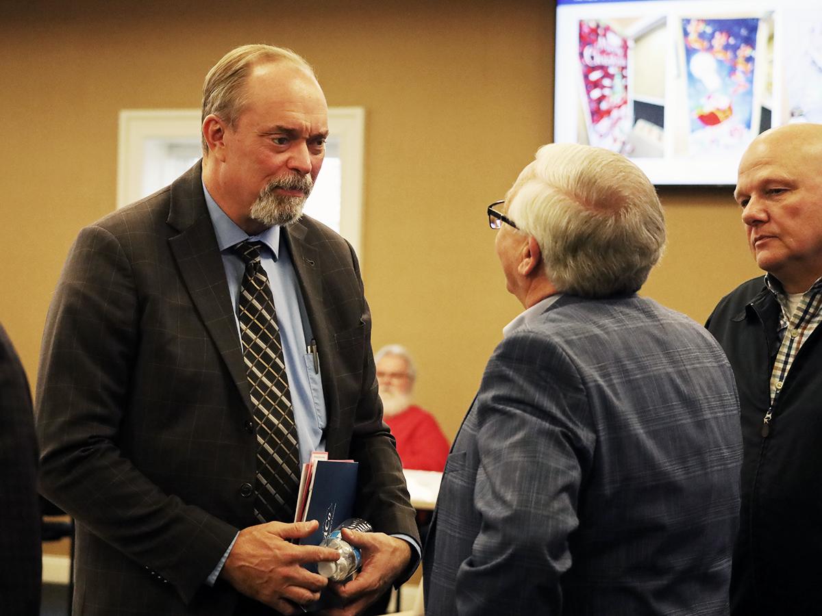 Whitley County Judge/Executive Pat White talks with KACo's Rick Stiltner following the quarterly Board of Directors meeting.