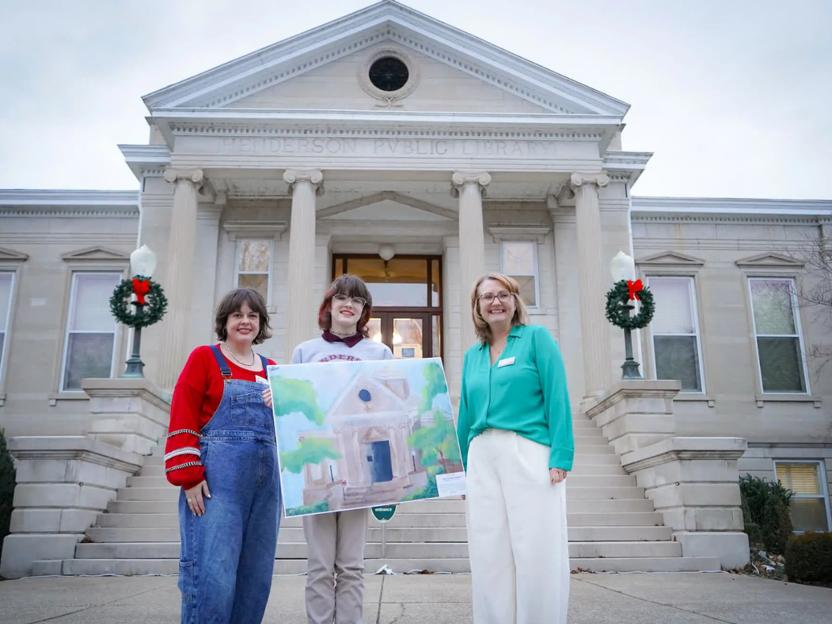 Seventh grader Bailey Moore, center, holds up her winning artwork from the KACo art contest in front of the Henderson County Public Library.