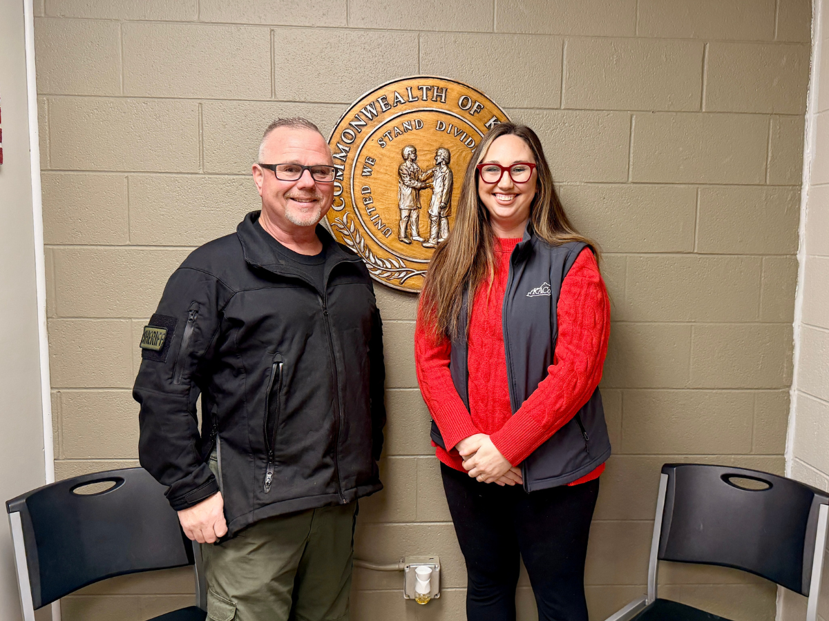 Fulton County Sheriff Chad Parker met with KACo's Lauren Carr for technical assistance on opioid settlement funds that can be used for community resources.