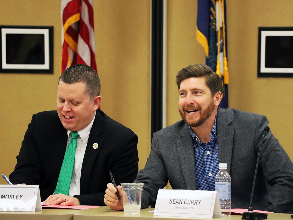 Judge/Executive Greg Terry, left, and PVA Association President Jonathan Bruer, both from Carlisle County, chat before the Board of Directors meeting.