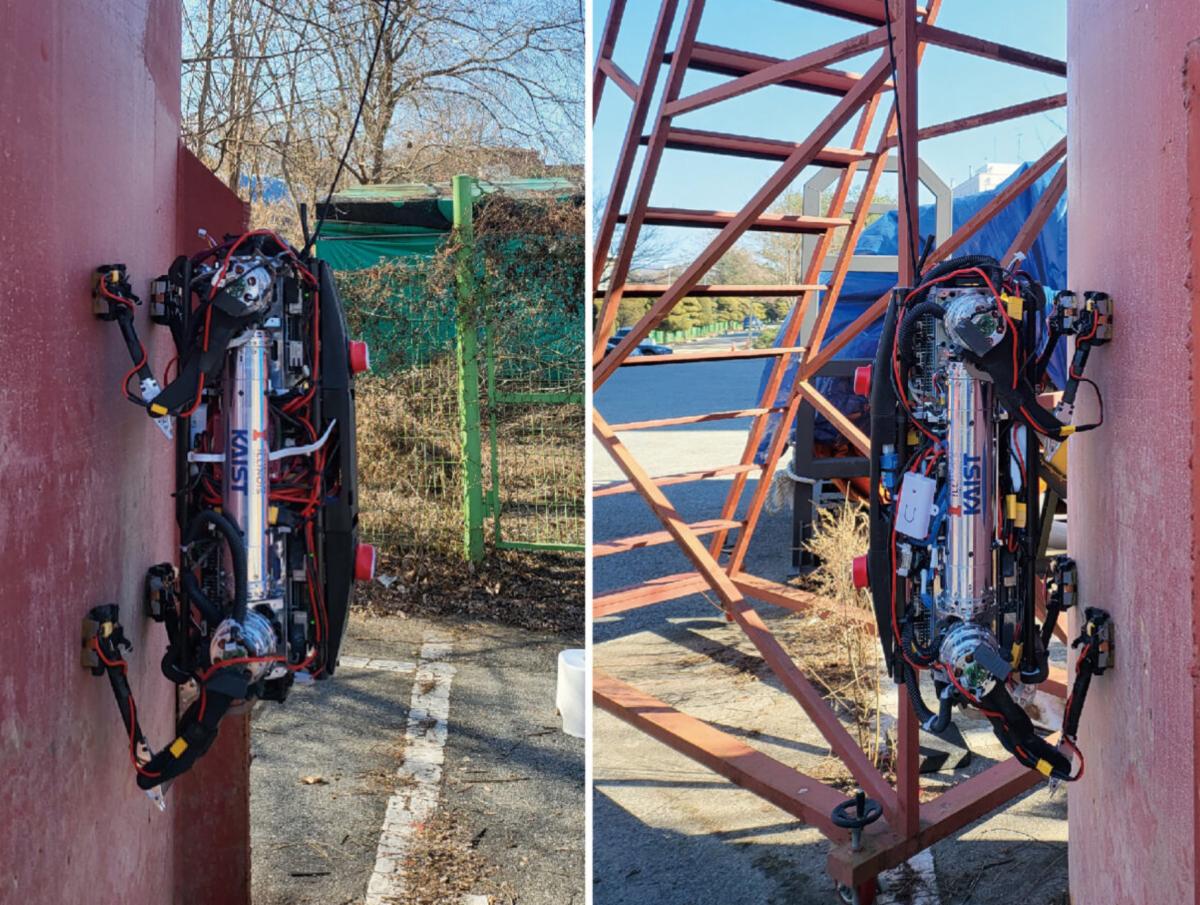 A trio of researchers at Korea Advanced Institute of Science and Technology, working with a colleague at the University of Illinois at Urbana-Champaign, has designed and built a working quadruped robot with magnetized feet that can climb on the walls and ceilings of metal buildings and structures.