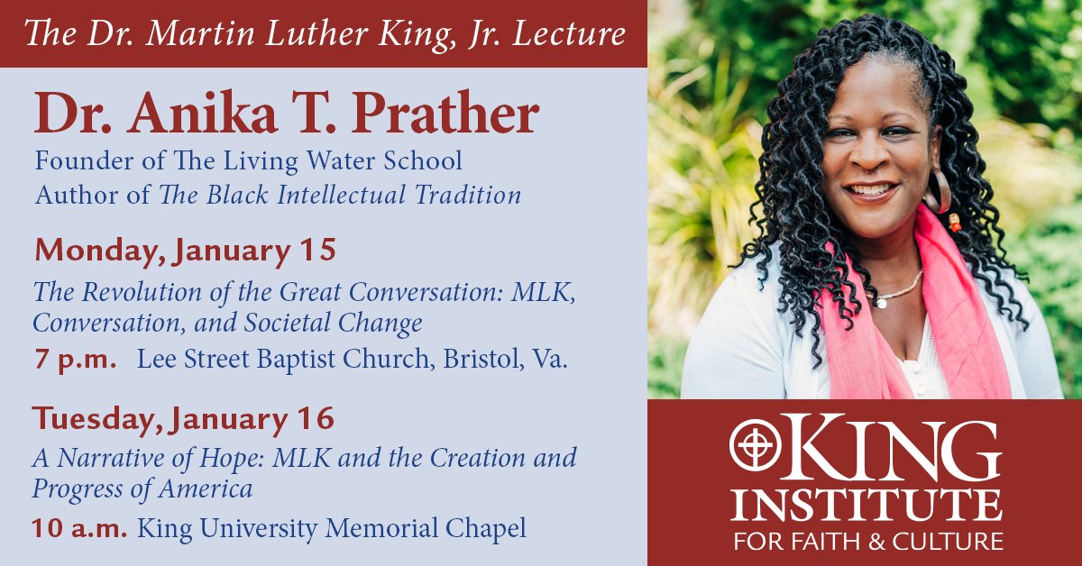 King University is excited to welcome Dr. Anika Prather for the Dr. Martin Luther King Jr. lecture this year. Dr. Martin Dotterweich said, "With a particular interest in Martin Luther King Jr.'s use of the classical tradition, Dr. Prather is also a leader in African American use of -- and place in -- the classical canon." Please join us for these special events: Monday, January 15th, at Lee Street Baptist Church in Bristol and Tuesday, January 16th, at 10 AM in the King University Memorial Chapel.