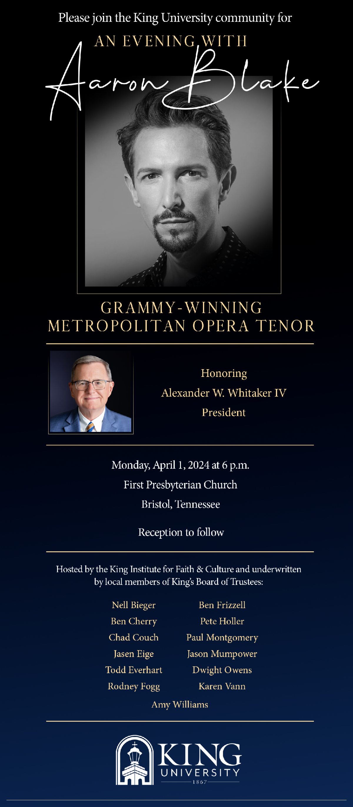 King University cordially invites you to join us on April 1, 2024, at First Presbyterian Church in Bristol at 6 p.m. for an enchanting evening with Aaron Blake, the acclaimed Grammy-winning Metropolitan Opera Tenor. Following Mr. Blake's performance, we will host a reception to celebrate the esteemed service of King University President Alexander Whitaker.