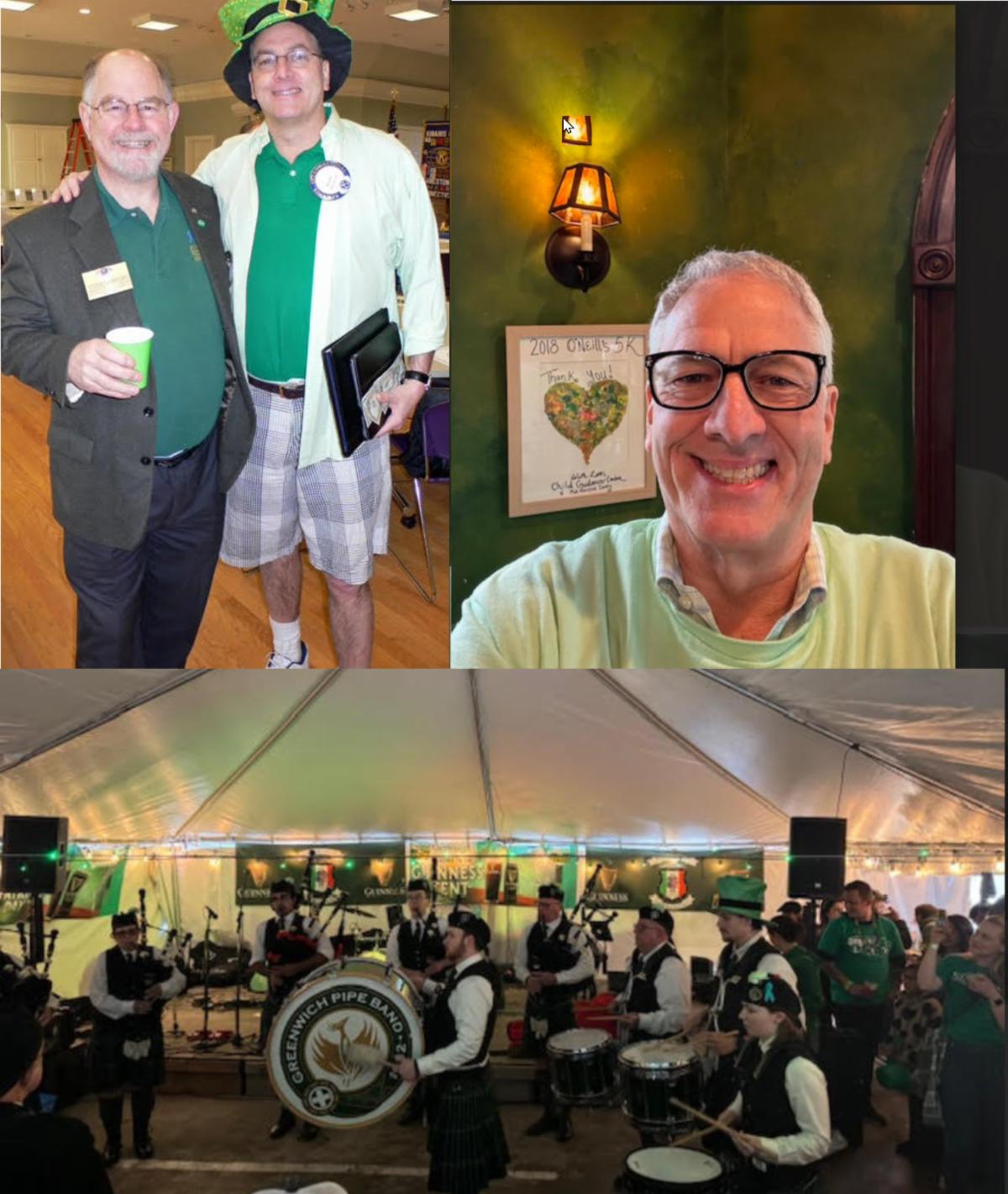 | | St. Patrick's Day 2012, left, with The Kiwanis Club of Greater Danbury's Foster Crawford and Kiwanis Club of Weston President Harry Spencer. On the right end bottom of this collage is President-elect Harry Monday, enjoying St. Patrick's Day 2025. | | |