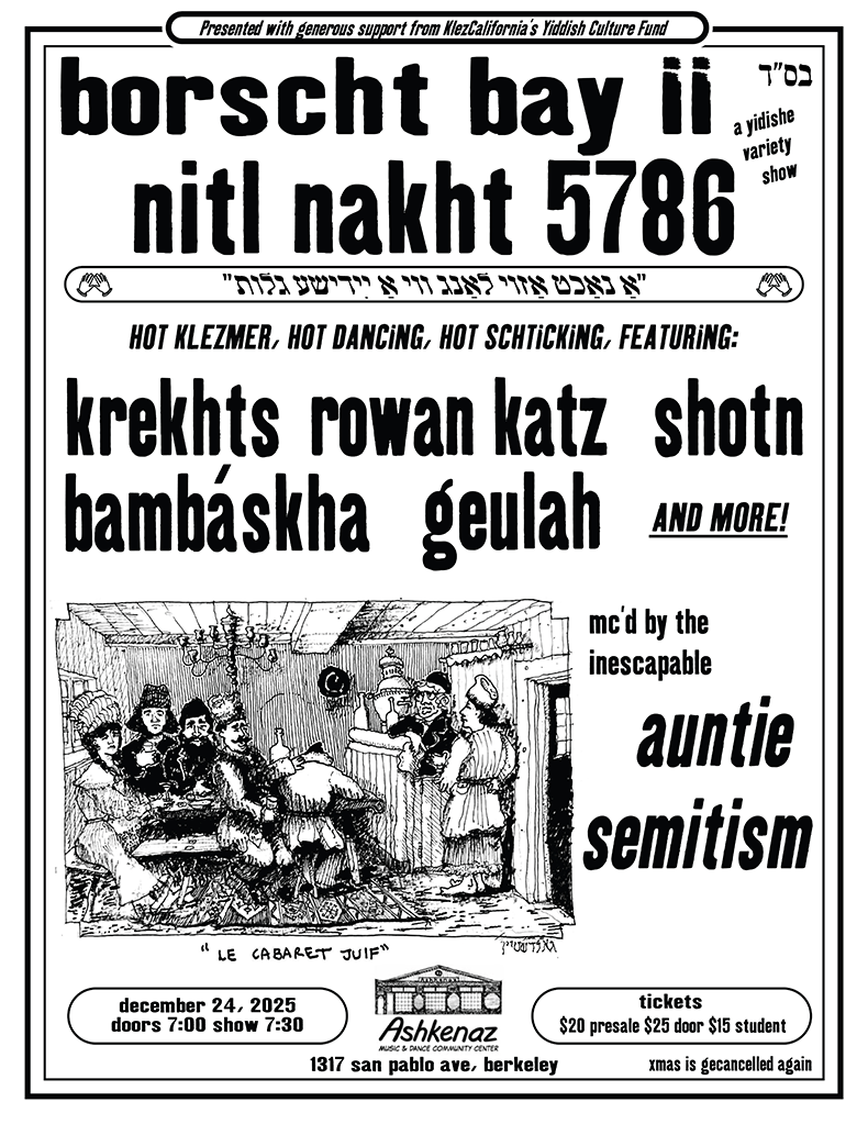 | | Yiddish Culture Fund Grantee | | Wednesday, December 24, doors open 7:30pm, show 8pm Ashkenaz Community Center, 1317 San Pablo Ave., Berkeley | | | | |