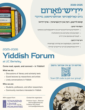 | | | | A Yiddish Forum is being organized at U.C. Berkeley by Professors Isaac Bleaman and Roni Masel. This is a new group for students, faculty, and Yiddish enthusiasts from the wider community who will gather together every two weeks to read Yiddish texts, listen to lectures, and converse in Yiddish. | | Thursdays starting September 11, 7 - 8 pm, Congregation Beth Am, Los Altos Hills | |