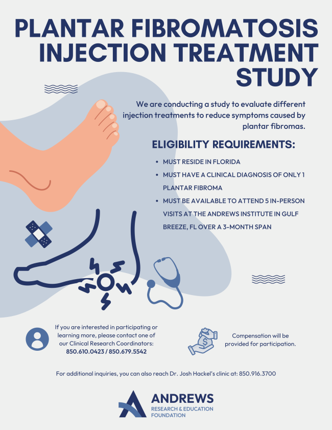 This study is aiming to evaluate different injection treatments to treat plantar fibromatosis. To be included in this study, patients must reside in the state of Florida, be clinically diagnosed with 1 plantar fibroma, and be available to attend 5 in-person visits to the Andrews Institute in Gulf Breeze, FL. Compensation to the participant will be provided. Please contact a clinical research coordinator at 850.610.0423 or 850.679.5542.