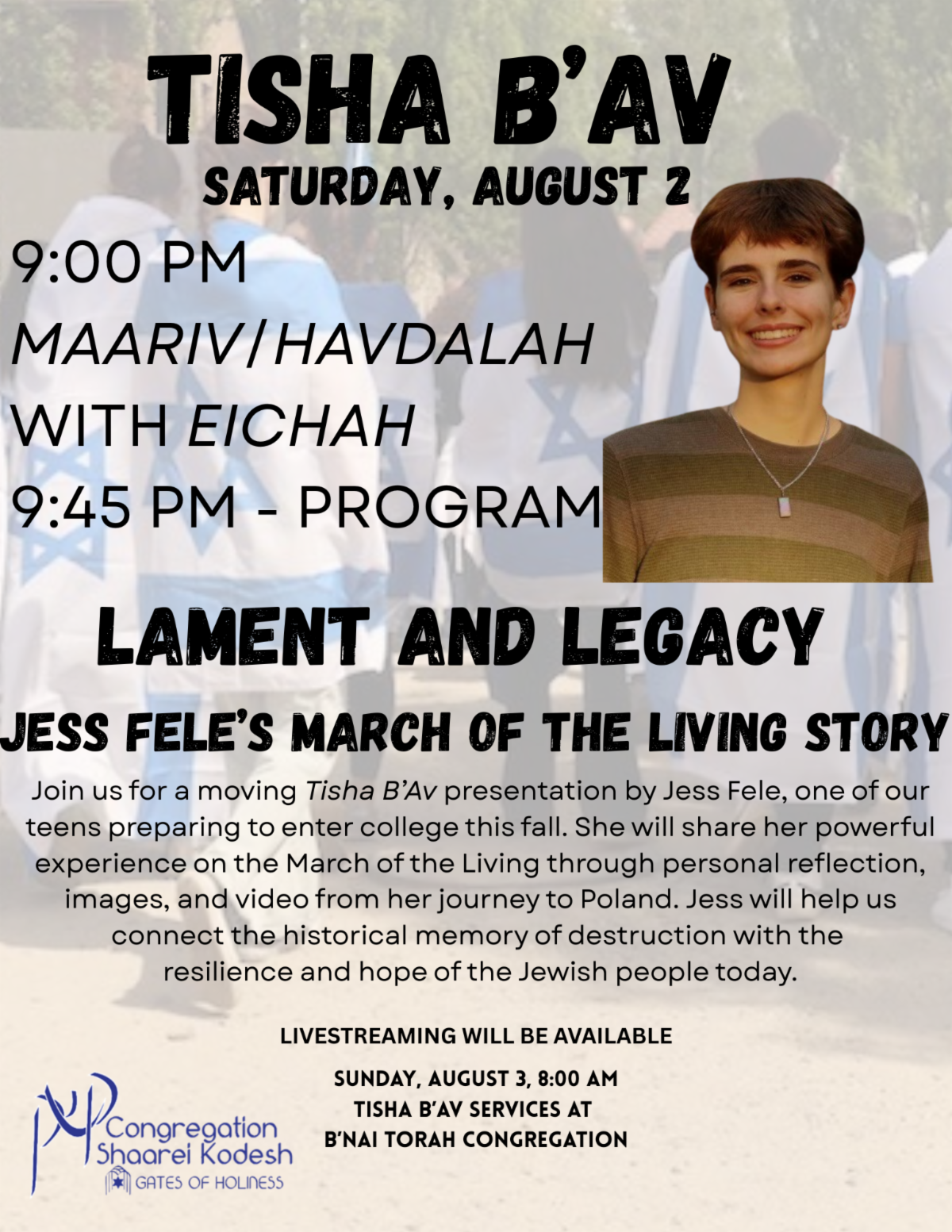 Friday night Kabbalat Shabbat services are on hiatus through August. Please call the office if you need a minyan to say Kaddish.