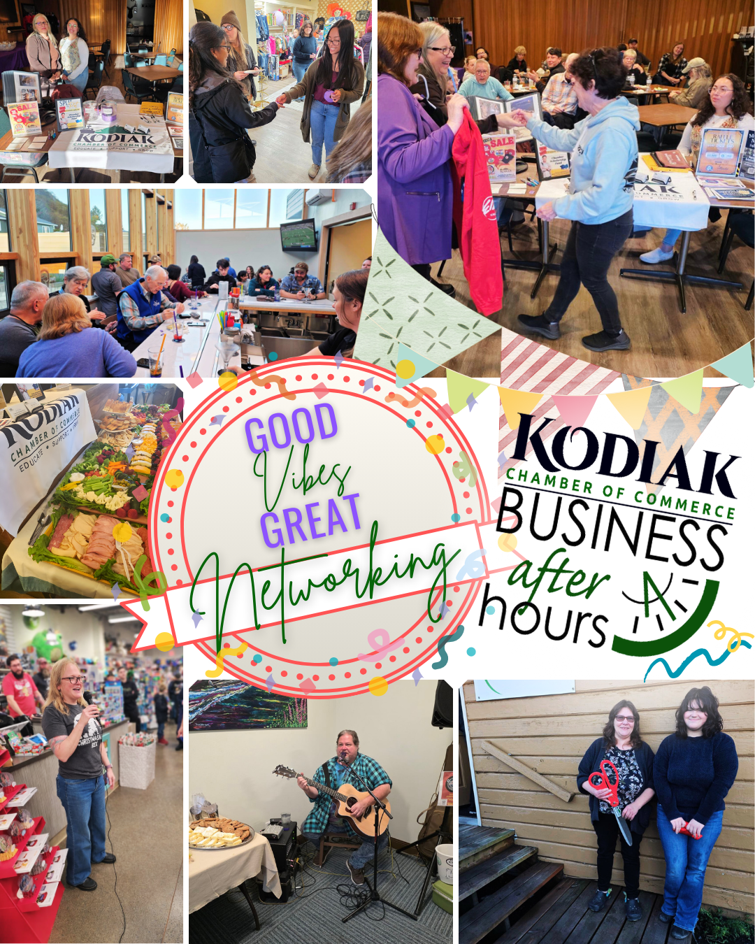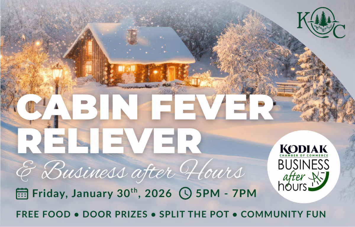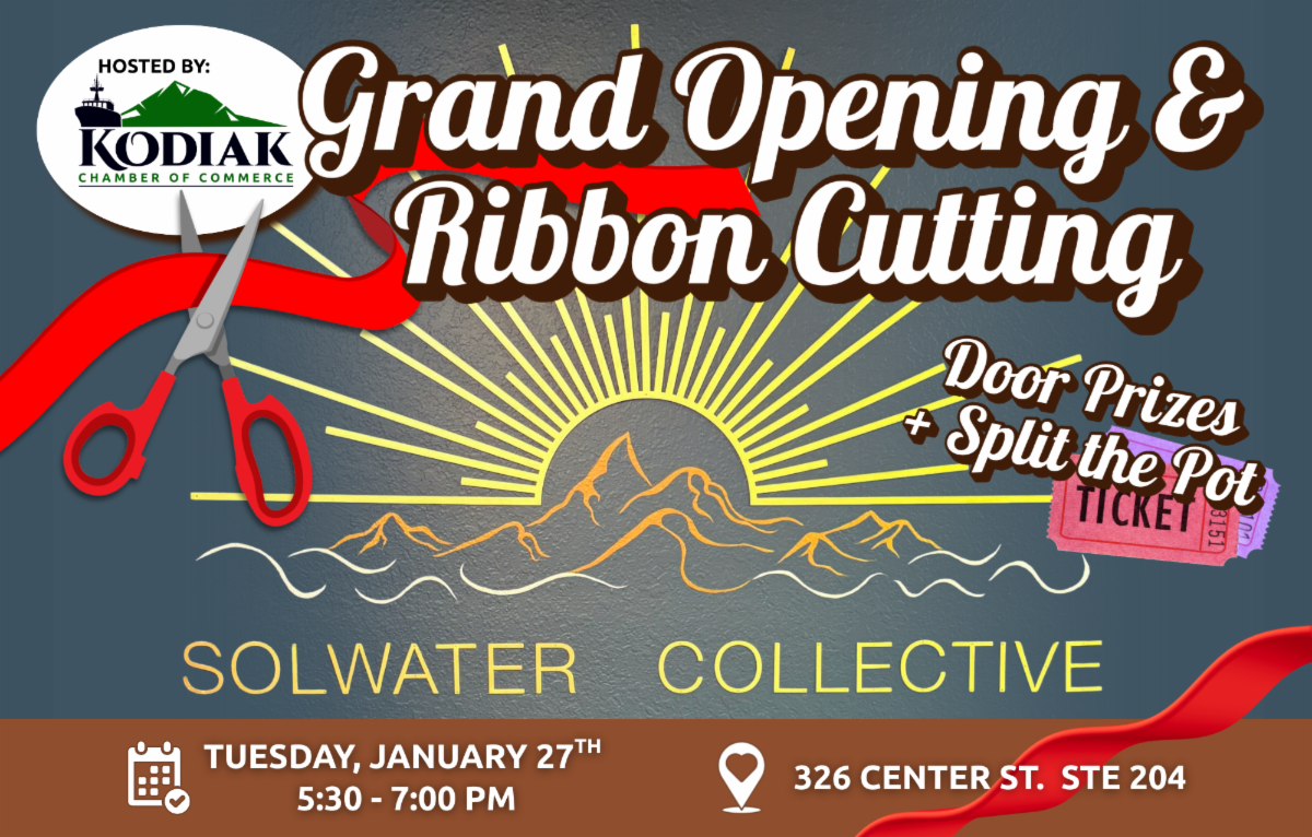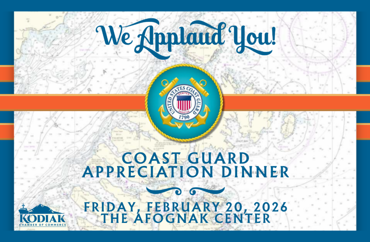 Here are a few of our upcoming events: Tonight join us at Solwater Collective for their Ribbon Cutting Ceremony and this Friday we hope to see you at the Kodiak College Cabin Fever Reliever Business After Hours. In February we’ll be helping Discover Kodiak with their Chocolate Lover’s Fling at the Marketplace on the 13th, the next week will be our Annual Coast Guard Appreciation Dinner on Friday the 20th, tickets are available through this newsletter and on our website right now, and the following weekend will be the Chamber’s first Kodiak Home Show! If you are interested in being a vendor sign up now while space is available.