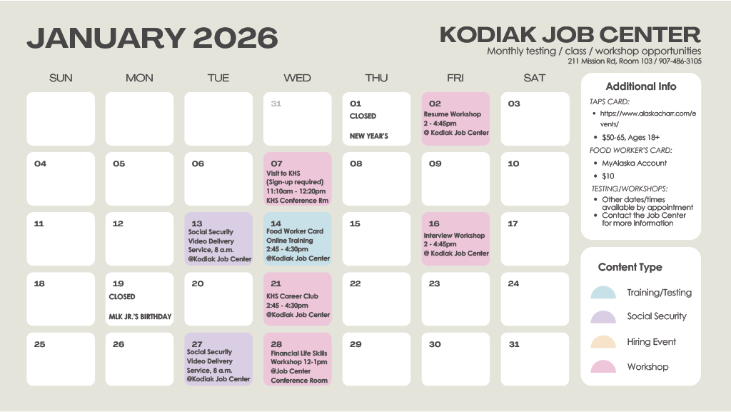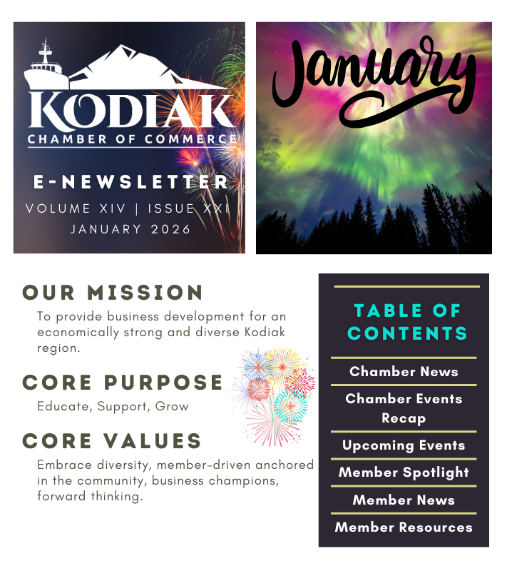 I hope that your year is off to a great start. The beginning of the year is when things really start to heat up for the Chamber. We are working on plans for the new Kodiak Home Show, the 2026 Relocation Guide, the Coast Guard Appreciation Dinner, ComFish, Community Clean Up Day and Crab Fest 2026. All of these events and our relocation guide will take place between February and May. From a new Kodiak Home Show Raffle (tickets are on sale now), to dinners, decorations, business after hours, and ribbon cutting ceremonies, as well as vendor signups, planning forum speakers and schedules and much, much more…when I I say that we’re busy, I really mean it.