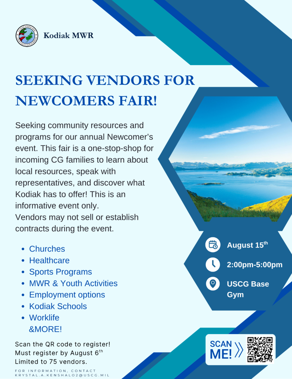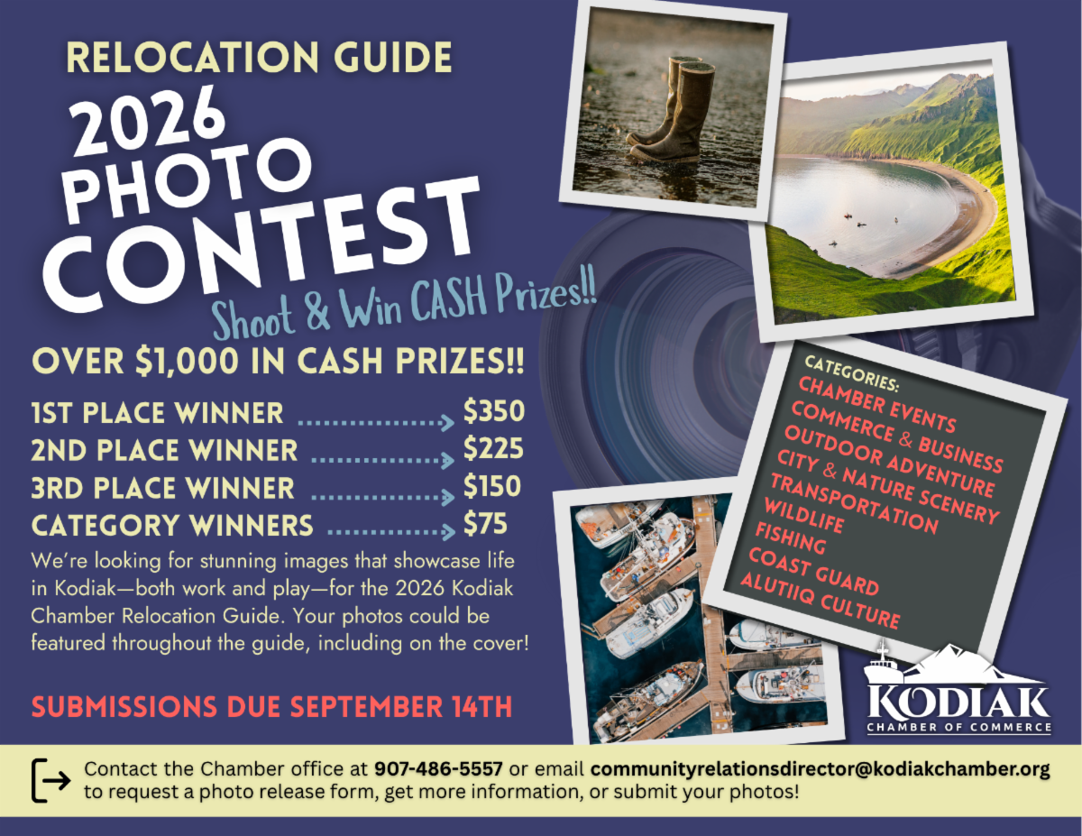 | | 2026 RELOCATION GUIDE PHOTO CONTEST | | Contact Jen at communityrelationsdirector@kodiakchamber.org or call 907-486-5557 for more information. | |