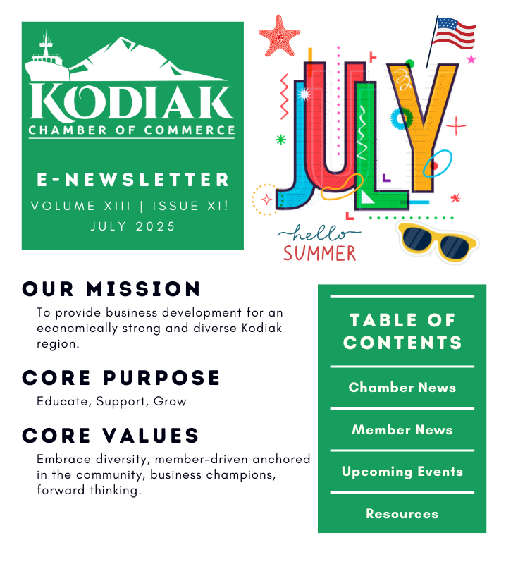 Thank you for your time, your continued support of the Chamber and our community, the Chamber's programs, and your membership! I hope you are able to get out and fully enjoy Kodiak in all its glory this summer.