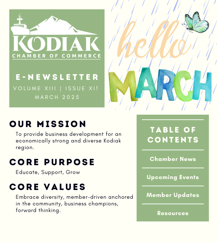 This month’s featured article is on new local business, Kodiak Social. You’ll also find a press release from the Kodiak Community Health Center that you’ll want to check out as well. To read these articles and the full newsletter be sure to click on view the entire message.
